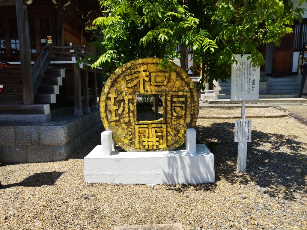 - 和同開珎の碑: 境内にそびえ立つ高さ120cmもの巨大な和同開珎のモニュメントは圧巻です。500円で金箔を購入し、碑に貼り付けて祈願するという、全国的にも珍しいユニークな参拝体験ができます。